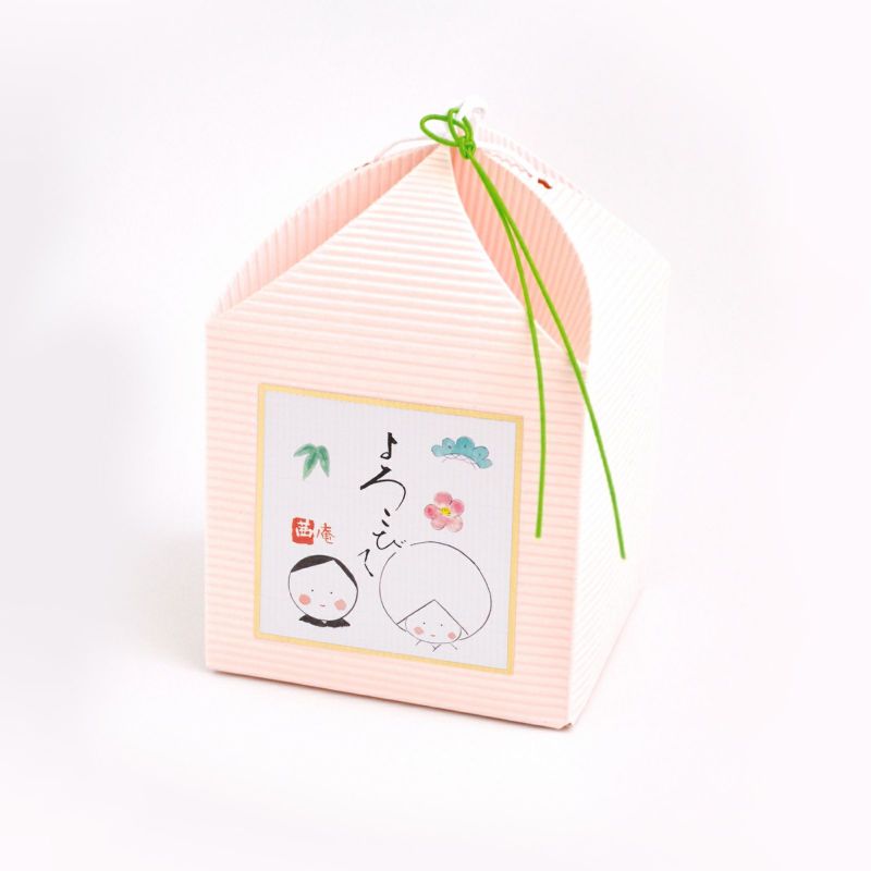 茜庵のロングセラー「ゆうたま」を、ブライダル専用のお箱でご用意。庵主のイラストに添えた、ハートをモチーフにした水引かざり。上品さの中にも温もりを感じるお仕立てです。