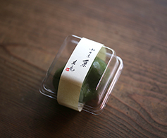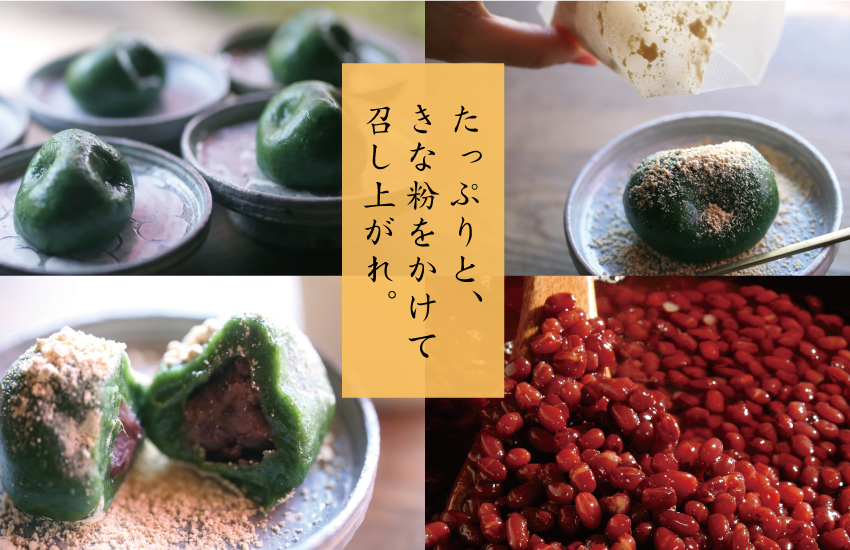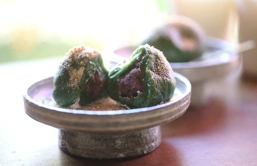 ふっくら炊いた、大粒の大納言。もっちり包むのは、よもぎの香。