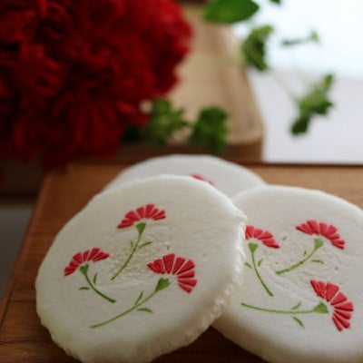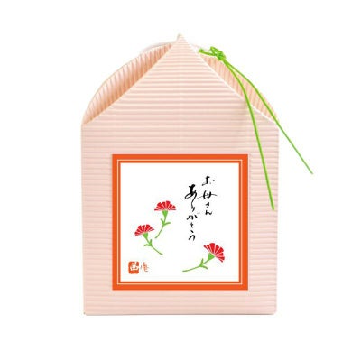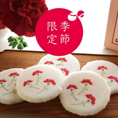 母の日限定の、カーネーション柄の風游姿。お菓子はひとつずつ個包装になっているので、少しずつお楽しみいただけます。お日保ちの長さも魅力のひとつ。