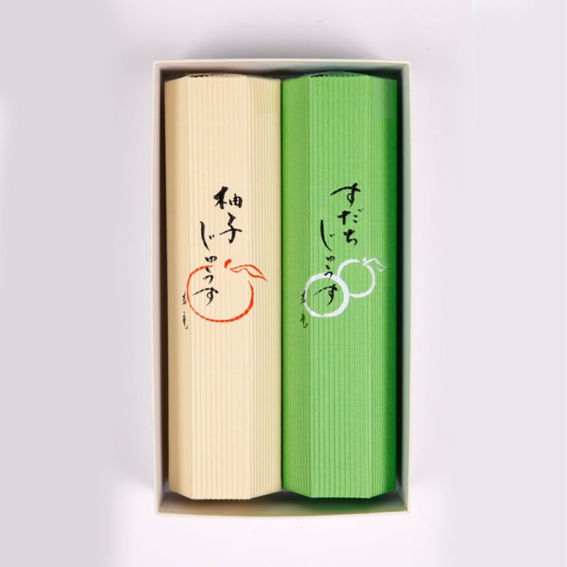 お日保ちもすることから、贈りものが重なりがちな季節にもおすすめ。柚子じゅうす/ すだちじゅうす / 山桃じゅうすの中から、お好きな組合せで2本お選びいただけます。