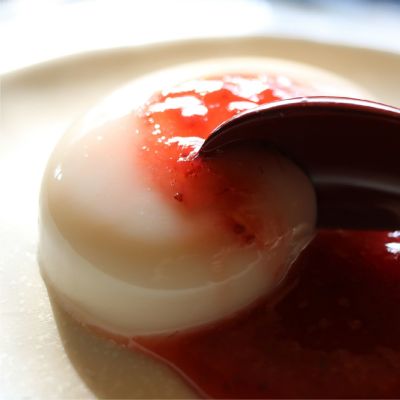 気長に炒った白ごまを とろりとろりと水挽きして仕立てた 春の水菓子。甘酸っぱい「さくらんぼいちご」の自家製ジュレを、ふわっとかけて。和洋折衷な春一番を、どうぞ。