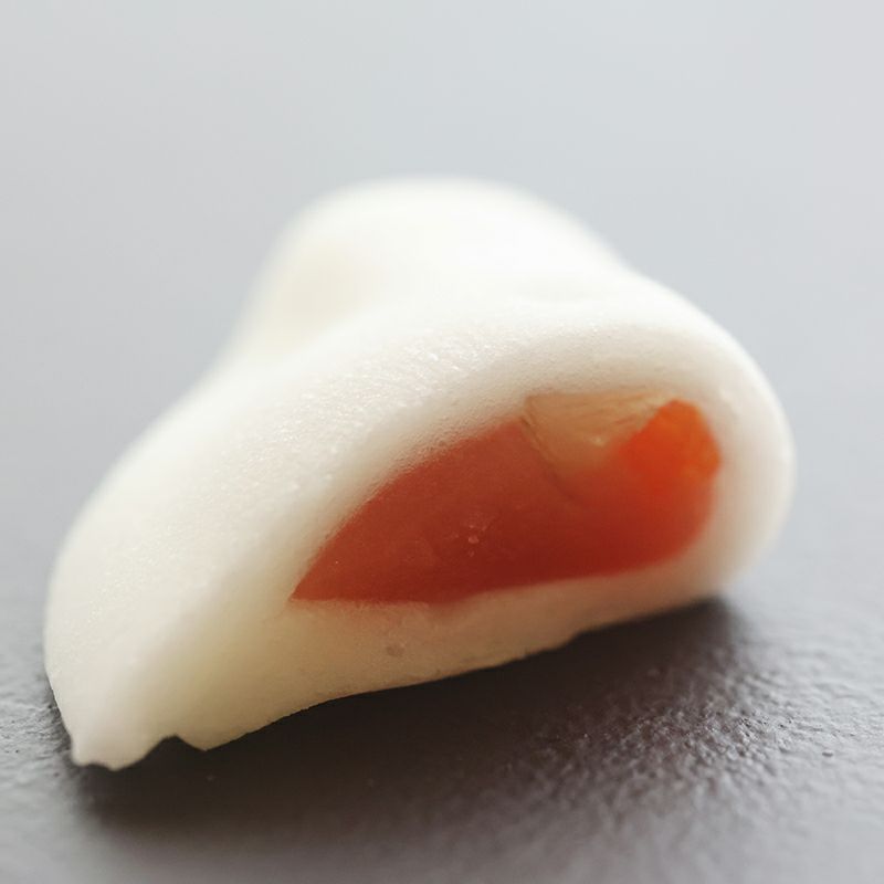 より風味豊かに、華やかに。茜庵の紅あんは、はんなりと柚子の香りを添えた白小豆のお仕立て。柔らかな乳白色をした「白小豆」は、生産量が非常に少なく、希少な素材。
