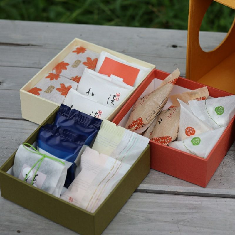 色合わせはもちろん、風味にもこだわって―「うも」「秋乃」はじめ、季節限定のお菓子たちを 彩りよく、風味豊かに詰め合わせました。濃いめに入れたコーヒーにも、よくあいます。