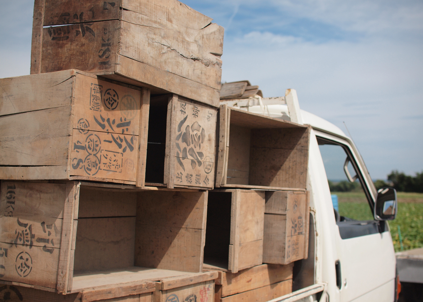 鳴門金時の収穫時には、りんごの木箱を使います。